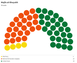 The Arbor Loyalty Party merged with United Green in 1742 AN. This did not result in all voters switching to the new party. The National Democratic Congress received more votes than the Nationalist Sri Pashana, which merged with the former. United Green remains the largest faction in the Majlis al-Nuwaab, holding 48.9% of the seats. It is followed by the National Democratic Congress with 31.9% of the seats.