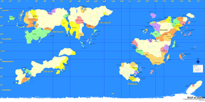 The GSO's map, Giess, consisted of four main continents: Novgard, Iotnargard, Grandica, and Novasolum. Grandica was self-consciously created in the image of the Grand Commonwealth, one of the great powers of the day, and hosted many of the GC nations. Novasolum was named after the Micras continent of Novasolum, and included Darcy's empire of Anthelia. Novgard, isolated in the west, hosted both Babkha and Stormark. Iotnargard was a "wild" continent, and there were a few RPs about people sending explorers to open up and colonize it.