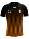 The shirt and shorts are black and socks are White or orange. |